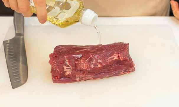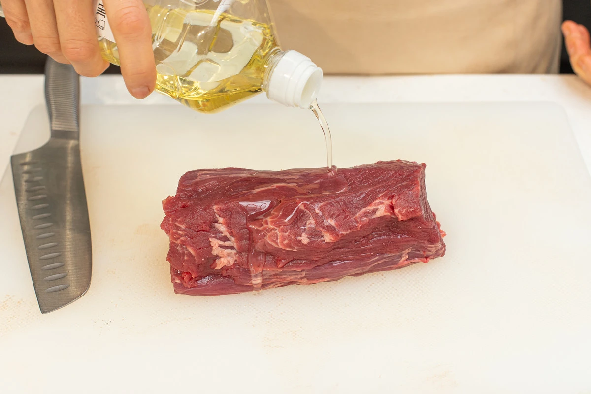 Вырезку полейте маслом и «обваляйте» в нём так, чтобы масло покрыло мясо со всех сторон.