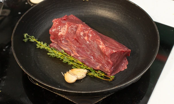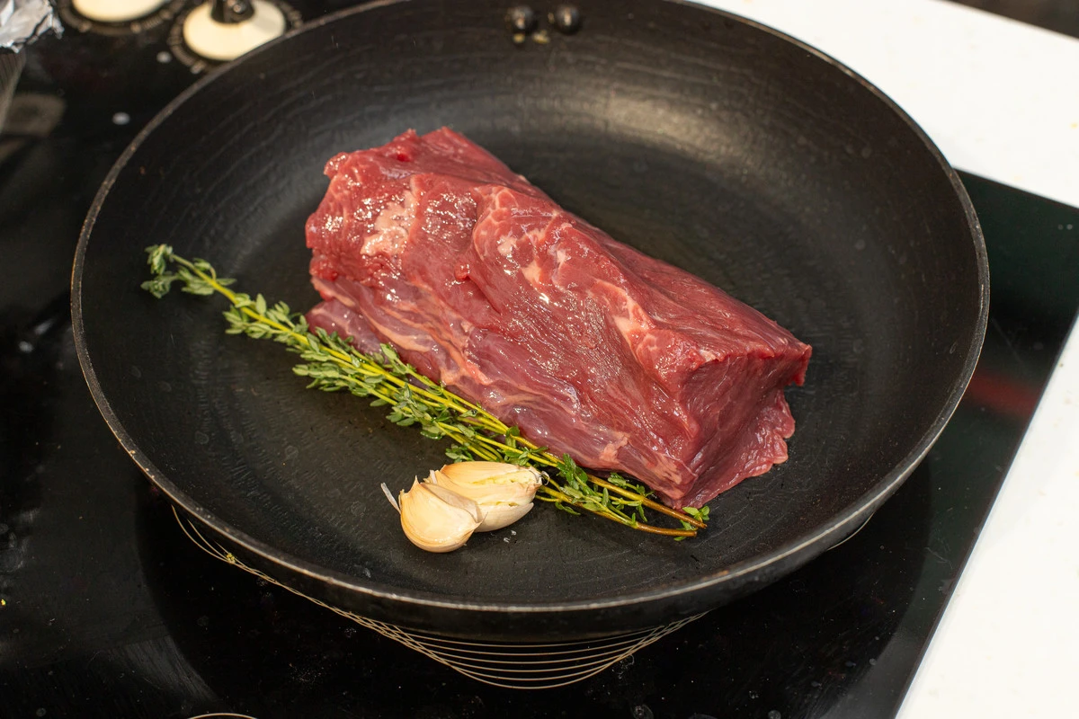 Раздавите чеснок ножом. Разогрейте сковороду и положите в неё чеснок, тимьян и вырезку. Готовьте на сильном огне примерно по 4 минуты с каждой стороны, чтобы запечатать все соки.