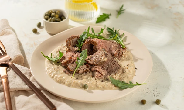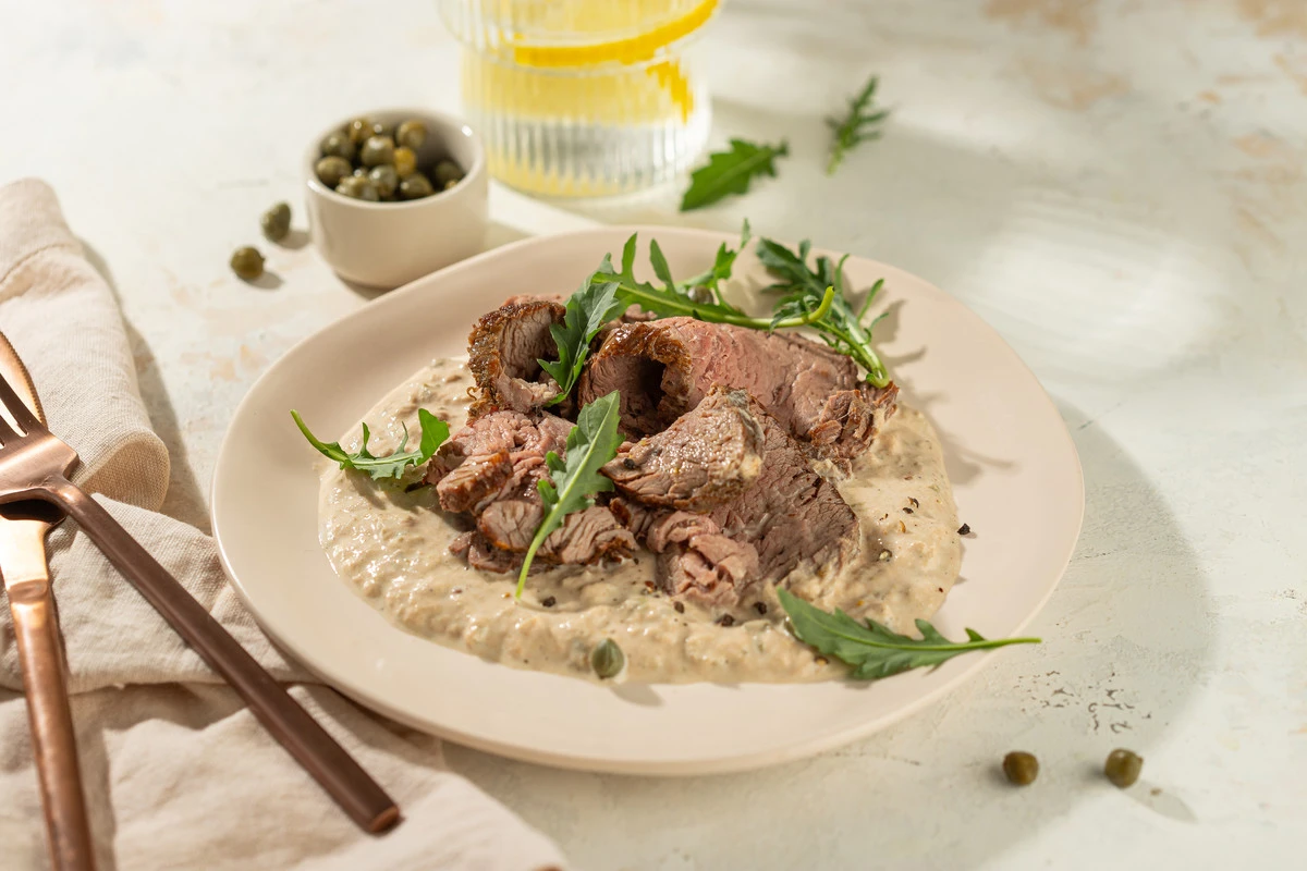 Нарежьте мясо тонкими ломтиками, выложите на тарелку, полейте соусом из тунца, украсьте руколой и каперсами и подавайте.