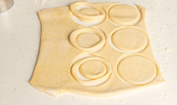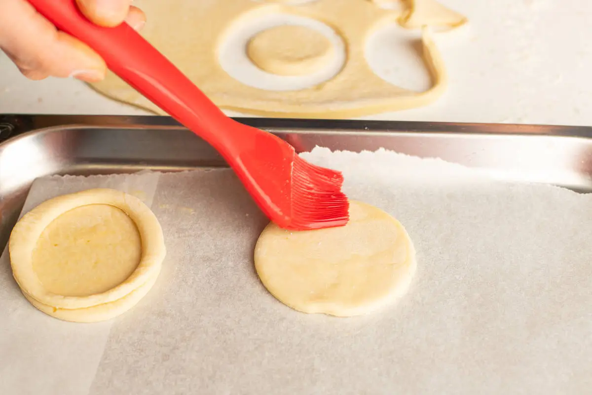 Тесто раскатайте в пласт толщиной 2-3 мм. Стаканом или сервировочным кольцом вырубите кружочки. Отложите половину получившихся кружочков и сделайте в них отверстия стаканом меньшего диаметра, чтобы получились кольца. Остатки теста можно собрать и раскатать ещё раз, чтобы использовать максимально.