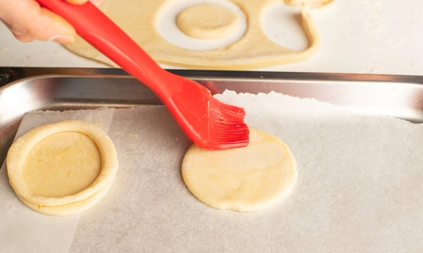 Яйцо взбейте вилкой. Смажьте кружочки яйцом, сверху положите колечки, они потом станут стенками волованов.