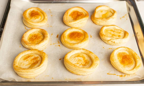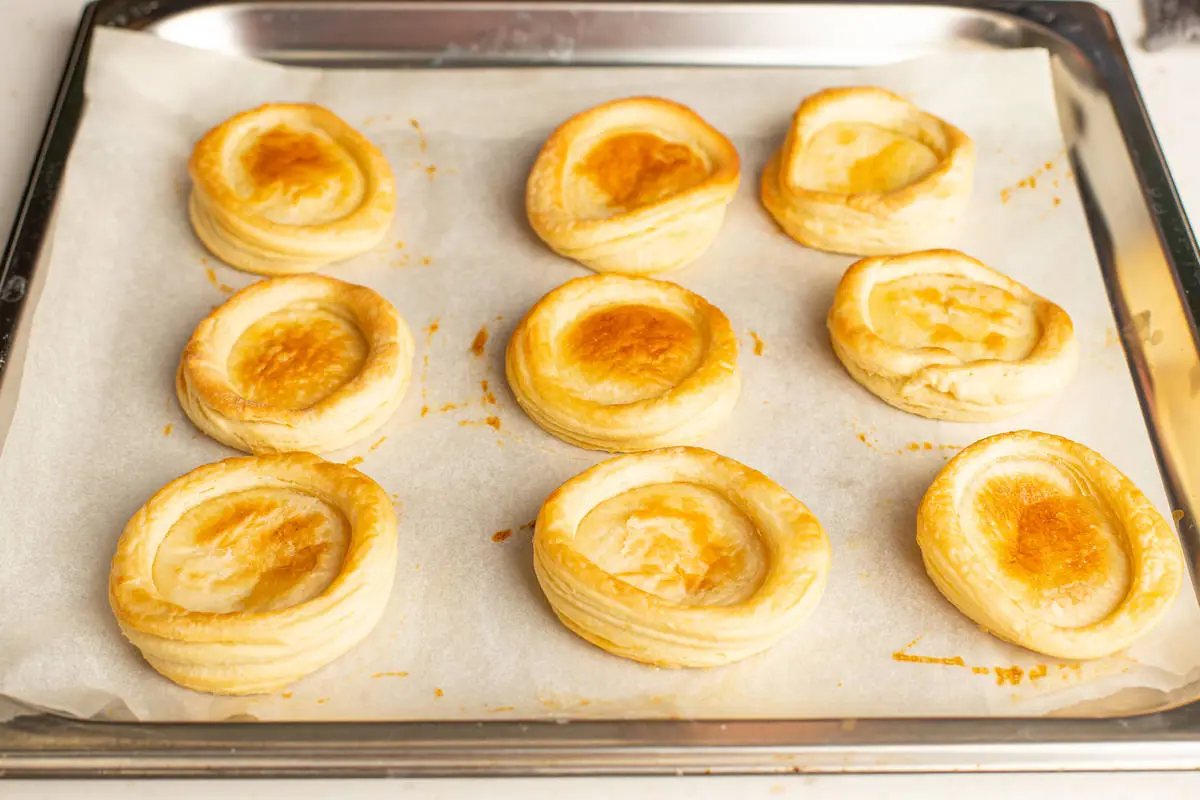 Выпекайте волованы при 180 °C около 15-20 минут до золотистости. Выньте из духовки и остудите.