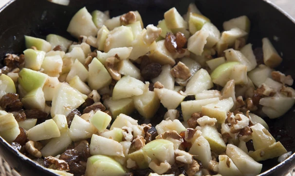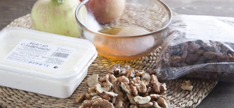 В маленьком сотейнике растопите сливочное масло и потушите яблоки, изюм и орехи около минуты, дайте остыть, затем смешайте с медом. Готово!