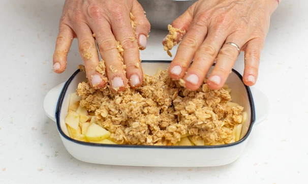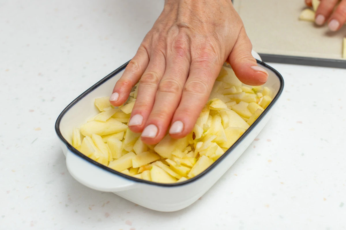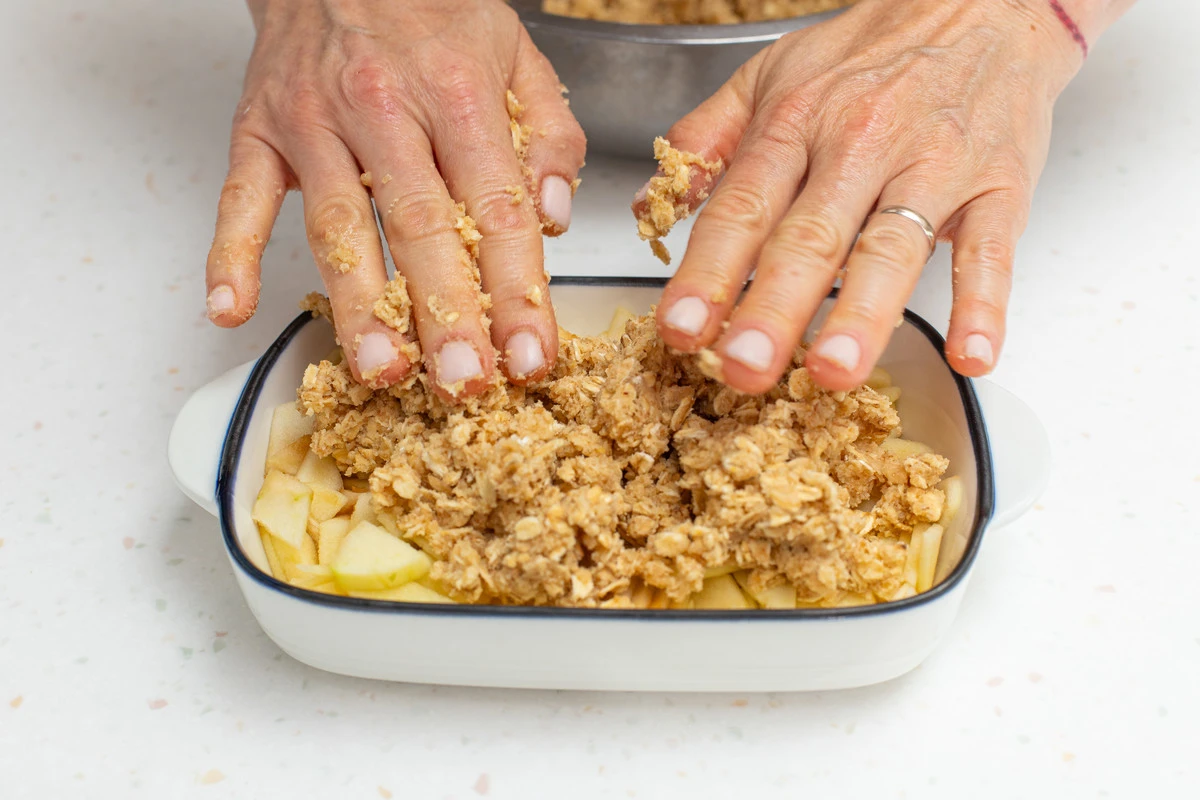 Выложите овсяную смесь сверху на яблоки, утрамбуйте. Поставьте форму в духовку и запекайте 30-35 минут при 160 °C до золотистого цвета.