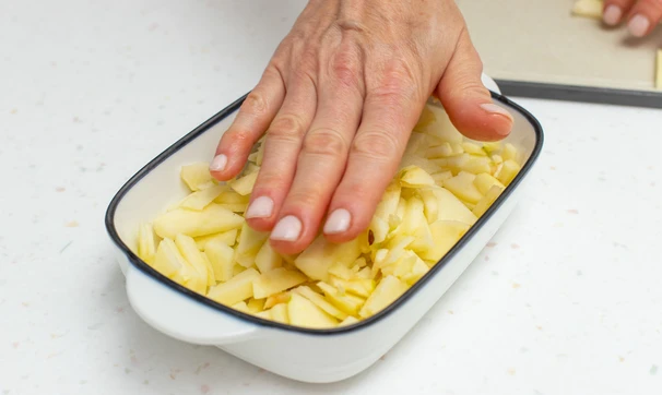 Выложите в форму для запекания 20 х 30 см и утрамбуйте руками.