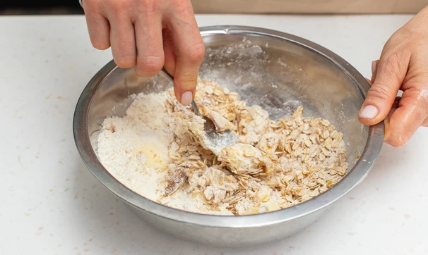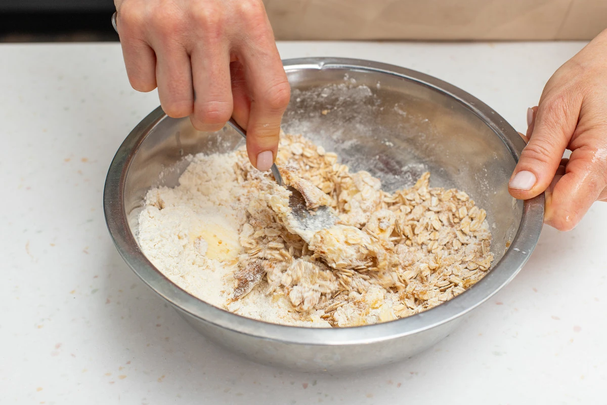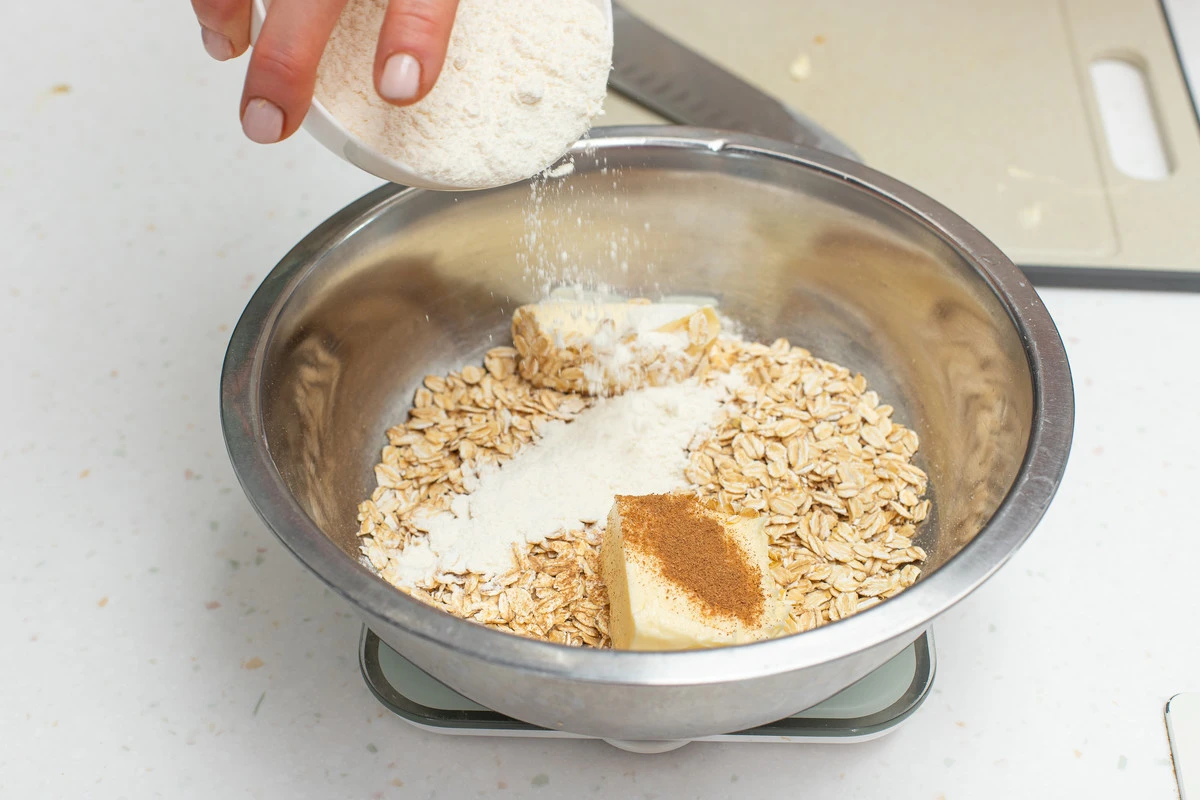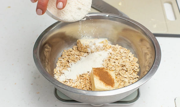 В миску выложите овсяные хлопья, муку, сливочное масло комнатной температуры.