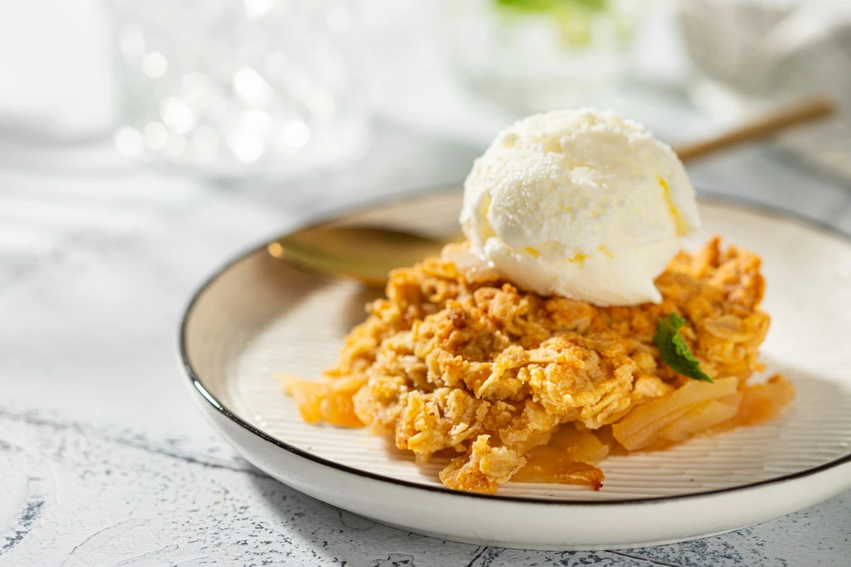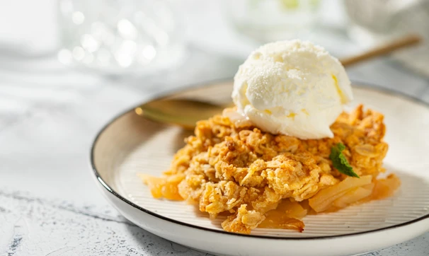 Подавайте горячий яблочный крисп с шариком пломбира.