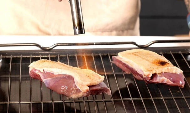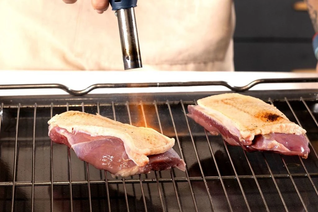 Утиные грудки протрите салфеткой и опалите кожу горелкой, чтобы удалить остатки перьев. Выложите грудки на решётку и запеките в духовке при 60 градусах в течение часа.