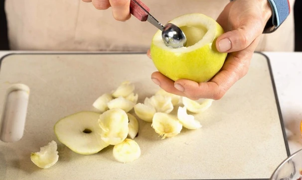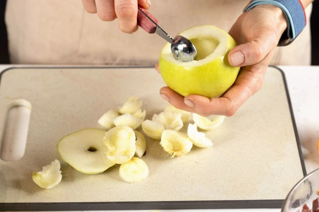 У яблок срежьте верхнюю часть — крышечки. Аккуратно выскребите мякоть маленьким ножом или специальной ложкой.