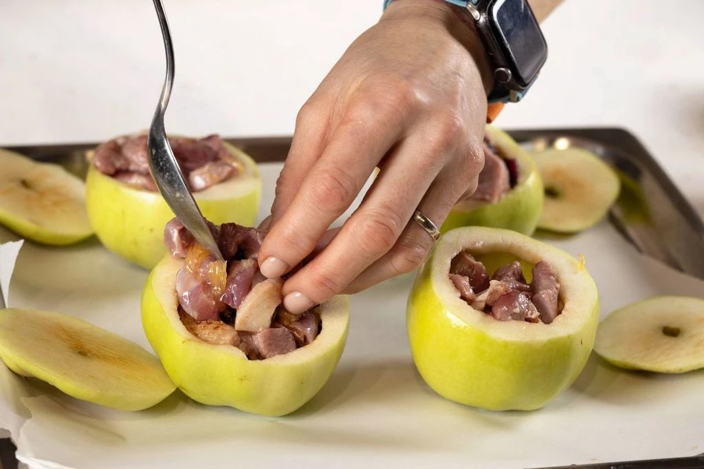 Нафаршируйте яблоки уткой, выложите в форму для запекания и верните в разогретую до 200 ℃ духовку на 15–20 минут. Яблоки должны стать мягкими, но сохранить форму.