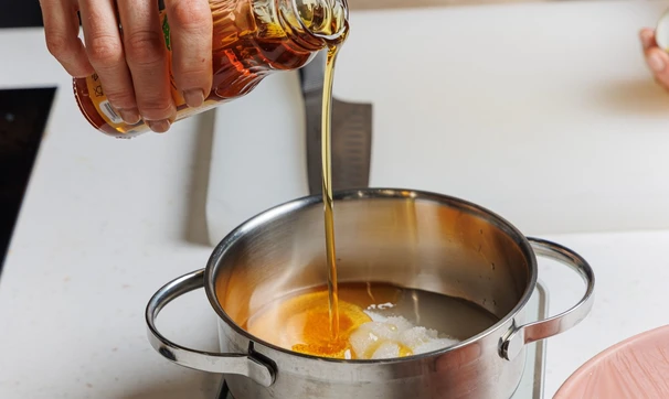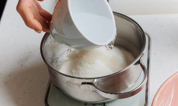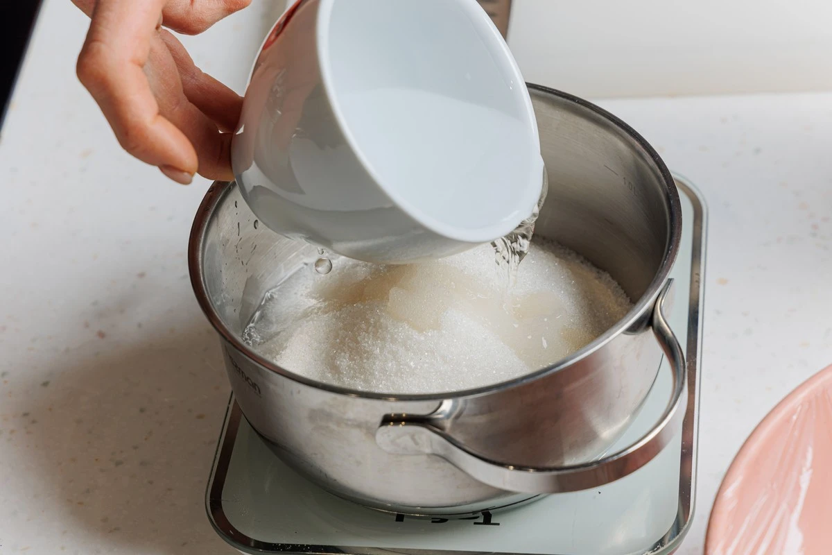 Растворите крахмал в воде. Насыпьте сахар в небольшую кастрюлю и добавьте воду с крахмалом.
