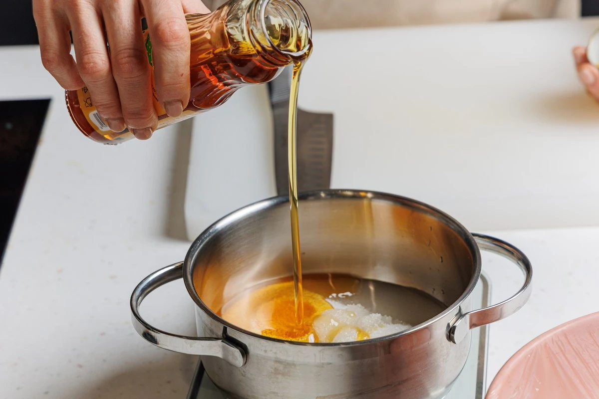 Налейте также сироп топинамбура. Поставьте кастрюльку на огонь. Перемешайте все ингредиенты, добавьте лимонный сок, ещё раз перемешайте и готовьте до растворения сахара. Доведите до кипения и варите на среднем огне до состояния «мягкий шарик» (если у вас есть кулинарный термометр, то до температуры 115–117 ℃) и карамельного цвета. Как сделать пробу на мягкий шарик: зачерпните ложкой небольшое количество сиропа и налейте в ледяную воду. Если сироп достиг нужной температуры и консистенции, из него в этом случае получится скатать мягкий, податливый шарик, похожий на пластилин.