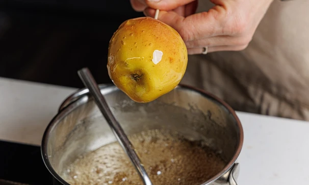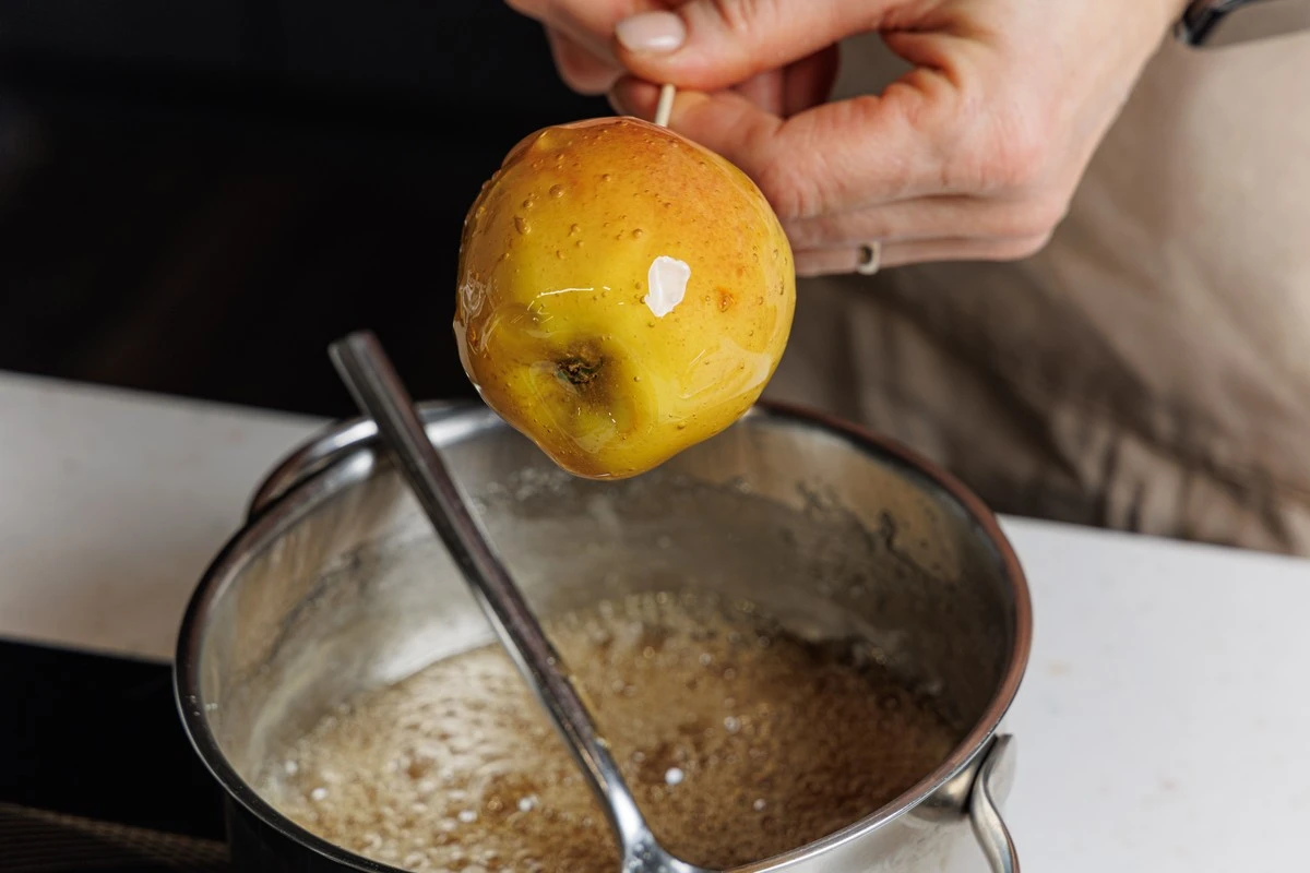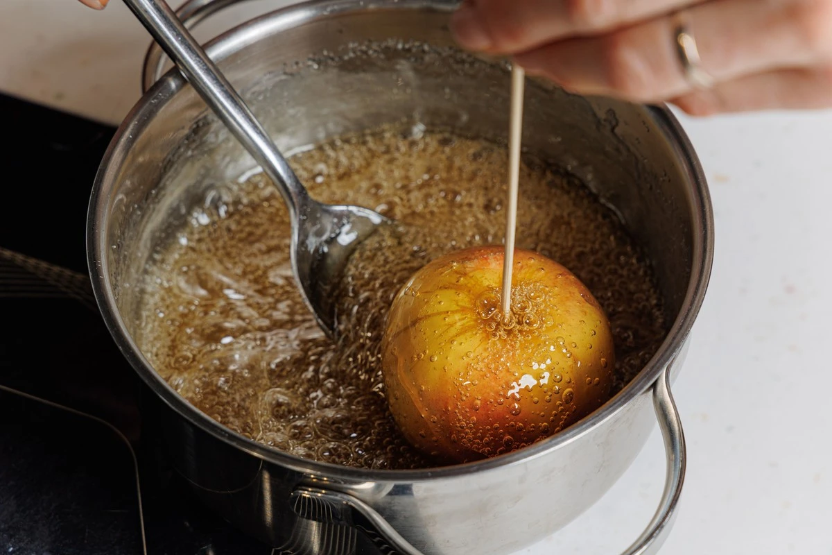Окуните каждое яблоко в карамель так, чтобы оно было покрыто карамелью со всех сторон. Оставьте остывать.