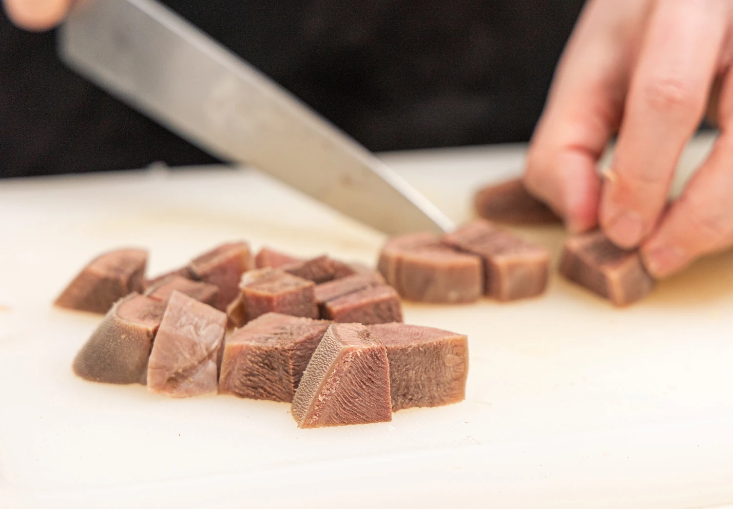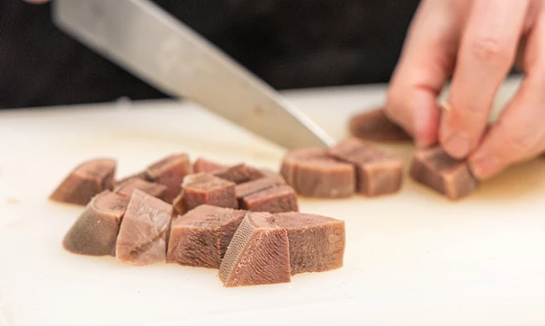 Готовый язык положите на несколько минут в ледяную воду, затем очистите от кожицы и нарежьте крупным кубиком.