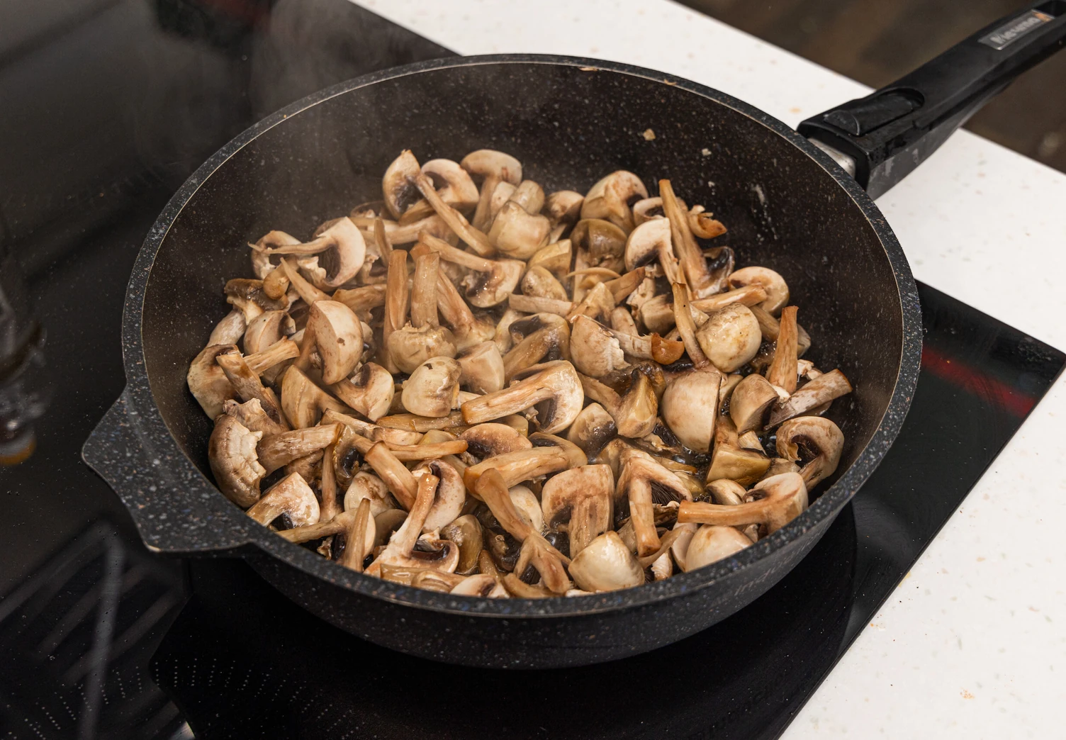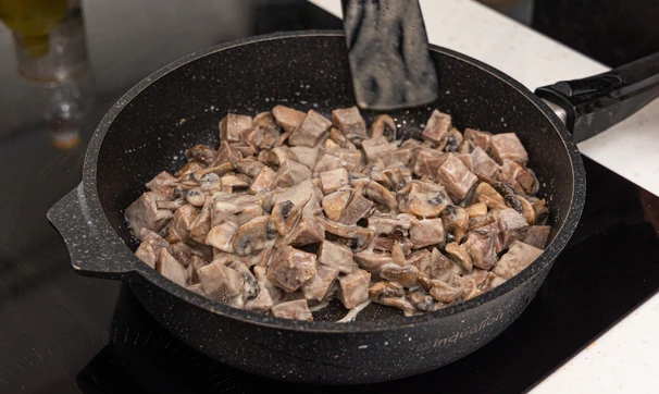 Разогрейте в сковороде растительное масло и выложите в сковороду нарезанные шампиньоны. Обжаривайте до золотистого цвета, периодически помешивая. Готовые грибы отложите в сторону.
