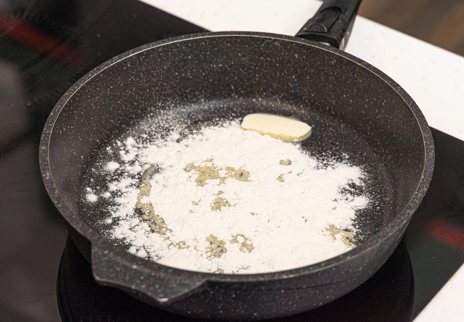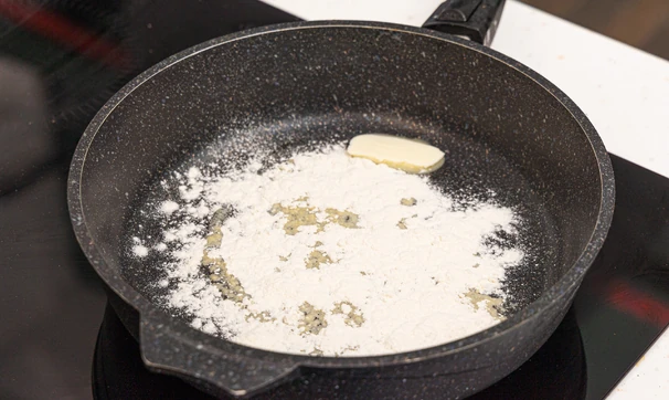 Разогрейте в сковороде сливочное масло, добавьте муку, перемешайте до состояния пасты и обжарьте до лёгкого золотистого оттенка.