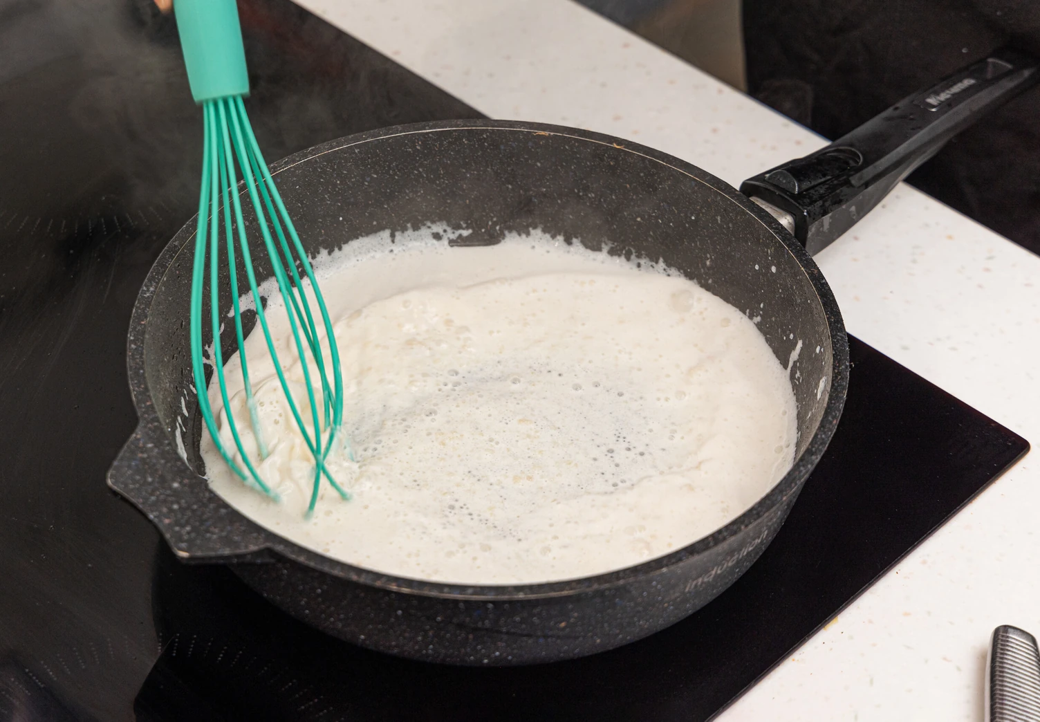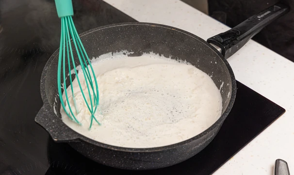 Тонкой струйкой влейте к муке тёплое молоко, энергично перемешивая массу. Добавьте немного бульона, в котором варился язык, а также всыпьте перец и соль. Прогрейте соус на медленном огне примерно 2–3 минуты.