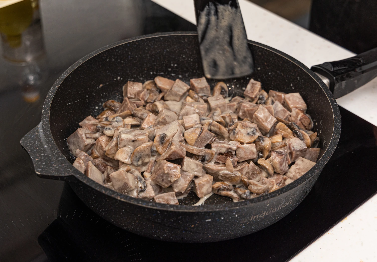 Добавьте к соусу жареные грибы и порезанный крупным кубиком язык. Тушите блюдо под крышкой в течение 10 минут.