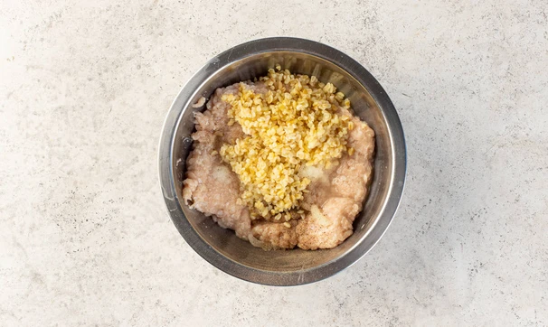 Смешайте фарш с булгуром, туда же натрите лук (используйте мелкую тёрку).