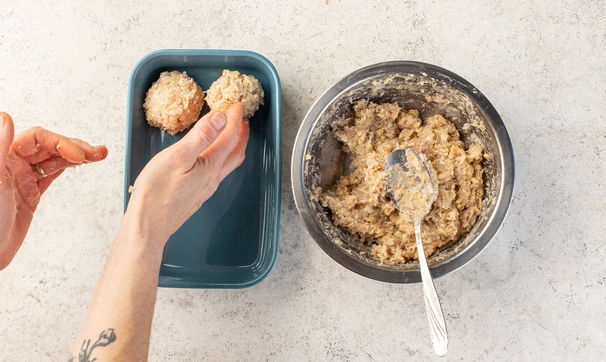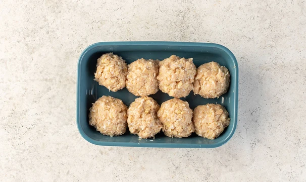 Скатайте из фарша шарики, выложите в форму для запекания.