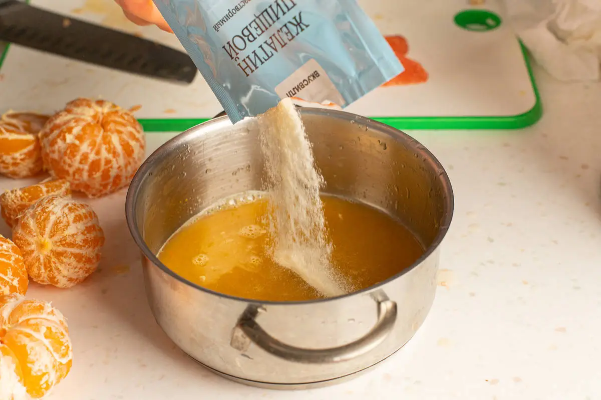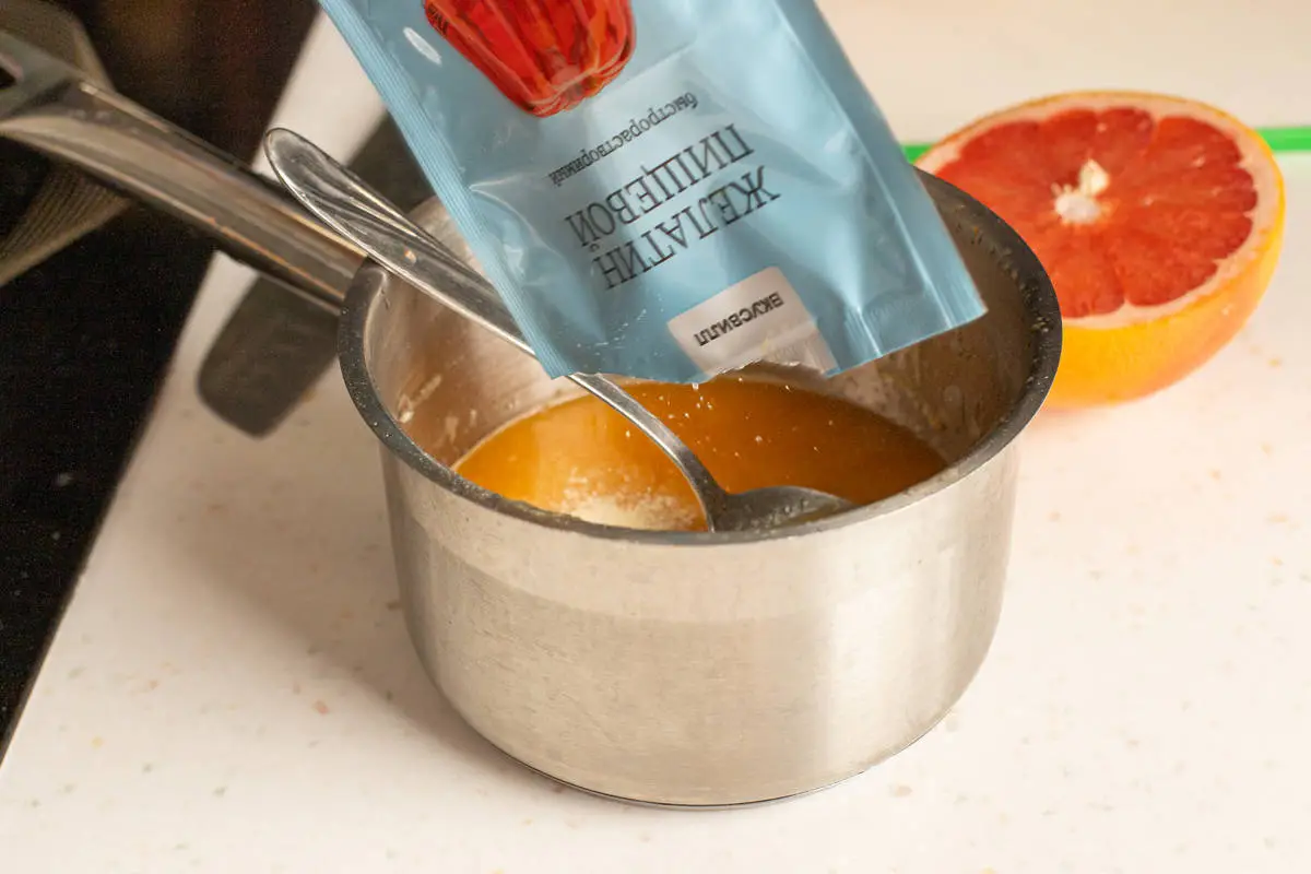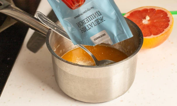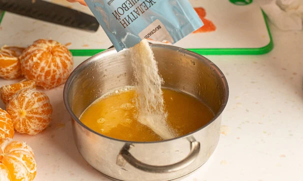 Выжмите сок из одного апельсина, разогрейте в сотейнике примерно до 60 °C и размешайте в нём 15 г (один пакетик) желатина до полного растворения.