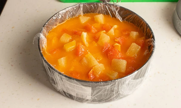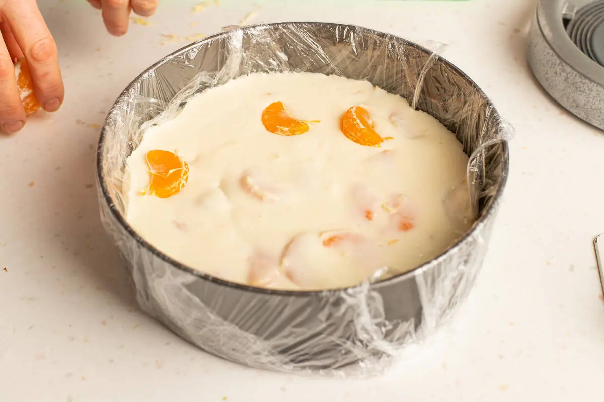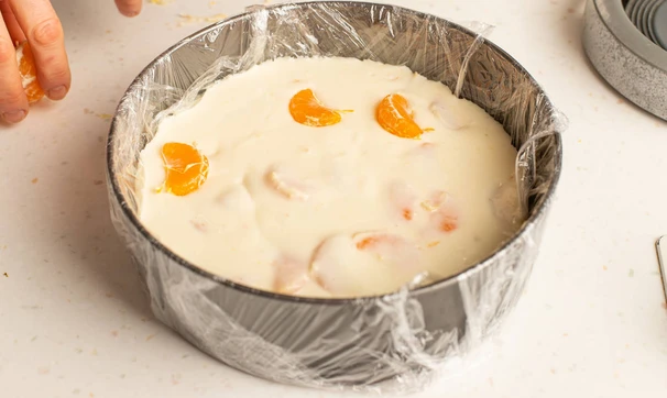 Подготовьте форму диаметром около 23 см, застелив её плёнкой. Залейте йогуртовый слой и уберите в холодильник до застывания на 30-40 минут.
