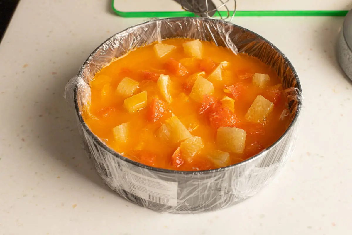 Смешайте с остальным соком и залейте второй слой в форму. Сверху разложите дольки цитрусов.