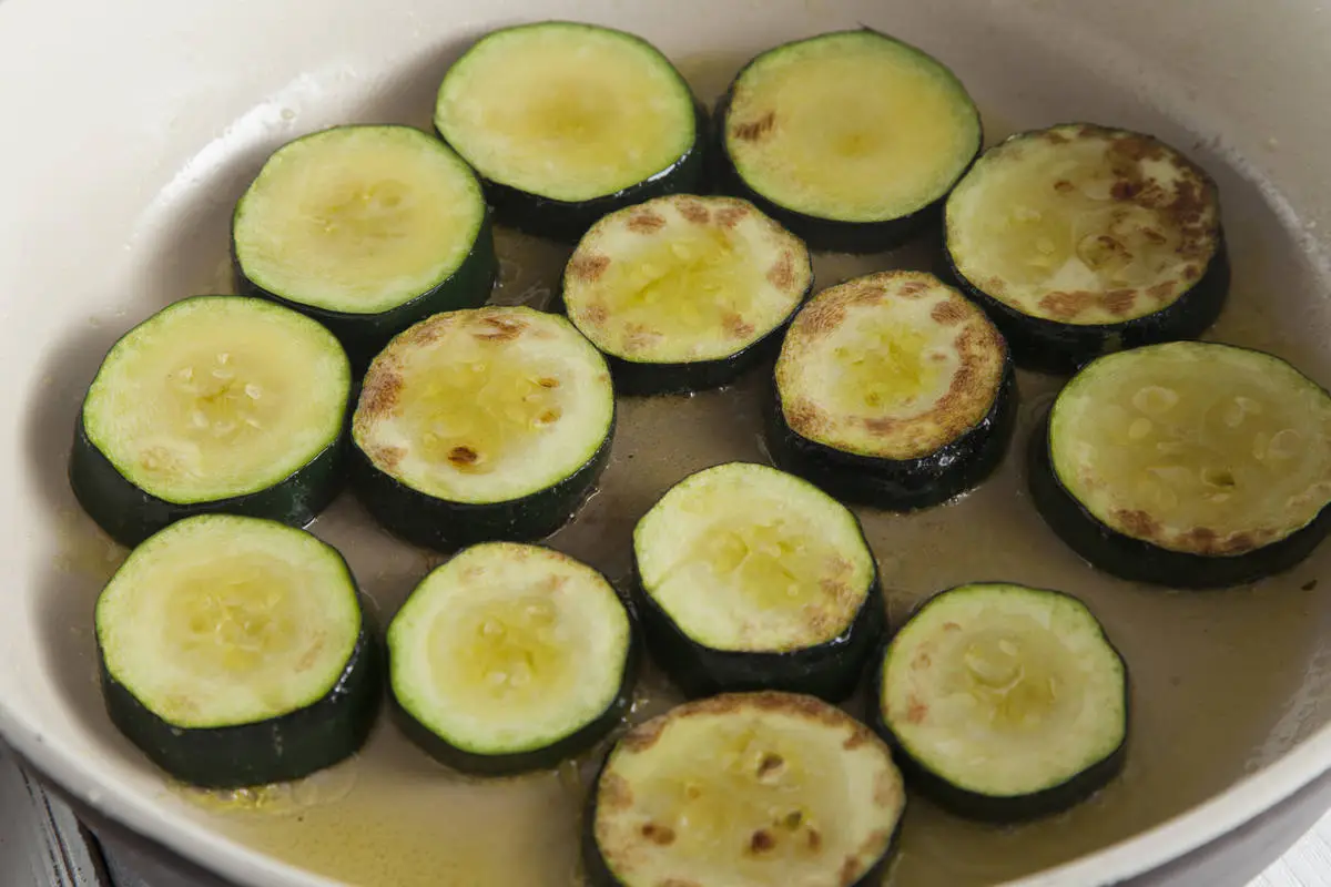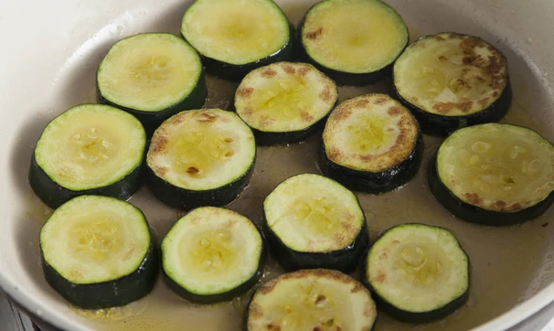 Цукини нарежьте кружочками толщиной около 1 см, посолите и обжарьте на оливковом масле с обеих сторон до готовности. Готовые цукини складывайте на салфетку, она впитает лишнее масло.