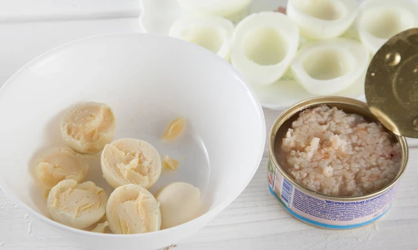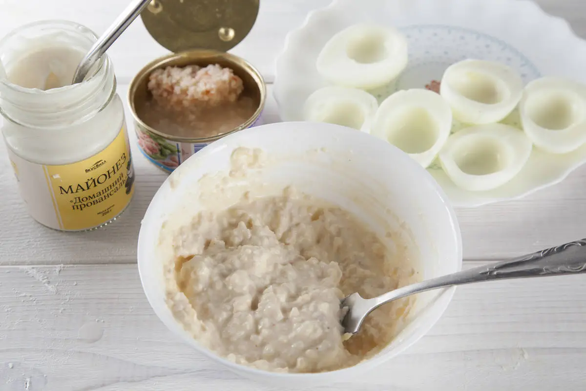 Вареные яйца очистите, разрежьте пополам и выньте желтки. Желтки разотрите вилкой с майонезом.