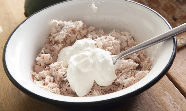 Тунца выложите в тарелку, разомните вилкой, добавьте греческий йогурт и хорошо перемешайте, посолите и поперчите по вкусу, размажьте равномерно по большому листу лаваша.