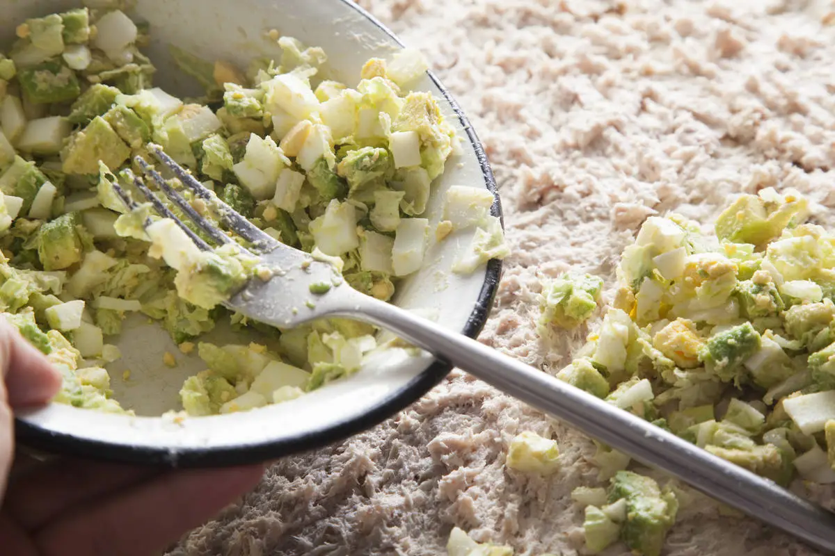 Спелый авокадо очистите от кожуры и нарежьте мелкими кубиками, сбрызните лимонным соком, порубите яйца и листья пекинского салата, смешайте, выложите поверх тунца.