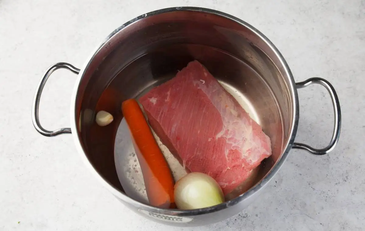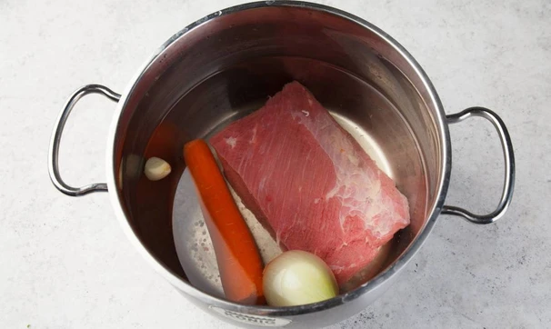 Для бульона грудинку залейте холодной водой (около 1,5 литров) доведите до кипения, снимите пену и убавьте огонь. Добавьте очищенные морковь и луковицу, лавровый лист и перец горошком, посолите. Варите бульон до мягкости мяса – около часа.
