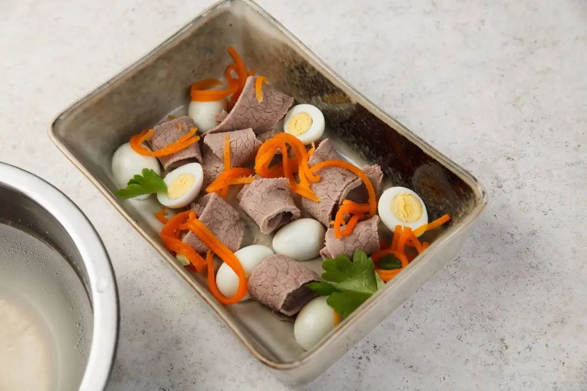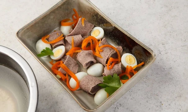 Перепелиные яйца сварите, остудите, очистите от скорлупы и разрежьте пополам. Мясо нарежьте тонкими ломтиками (поперёк волокон), морковь – длинными тонкими полосками (или измельчите на тёрке для моркови по-корейски). В подходящую форму выложите мясо, свернув рулетиками, половинки яиц, ломтики моркови, листики петрушки.