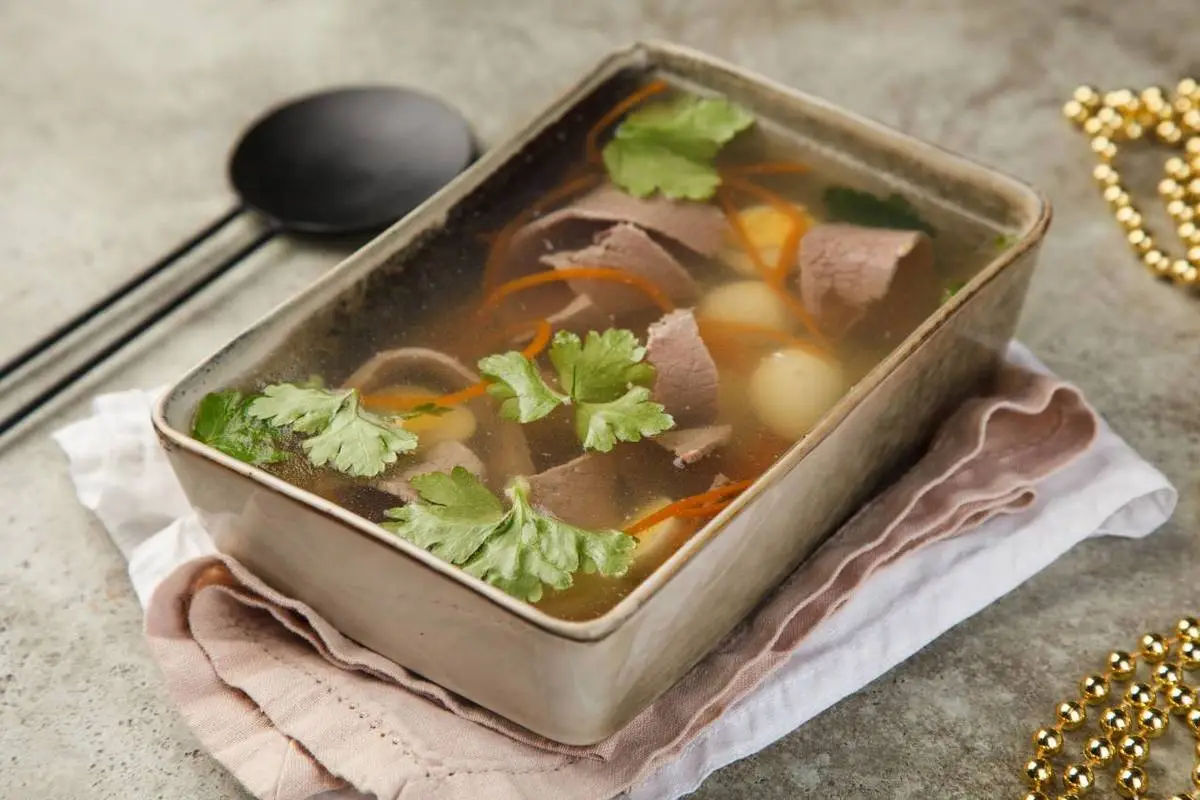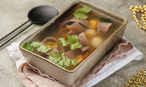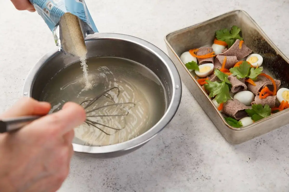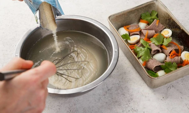 Готовый бульон процедите, отлейте в мисочку примерно 200 мл. Дайте немного остыть и растворите в нём желатин, тщательно размешайте венчиком. Добавьте желатиновую смесь к остальной части бульона и ещё раз перемешайте, при необходимости процедите. Добавьте рубленый чеснок в бульон, если любите заливное с чесноком.