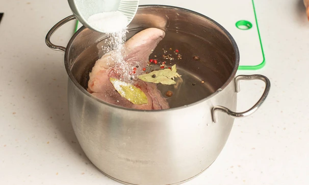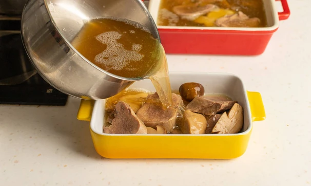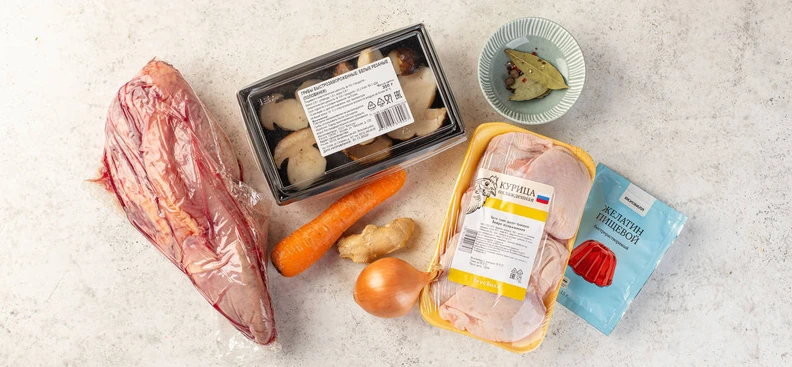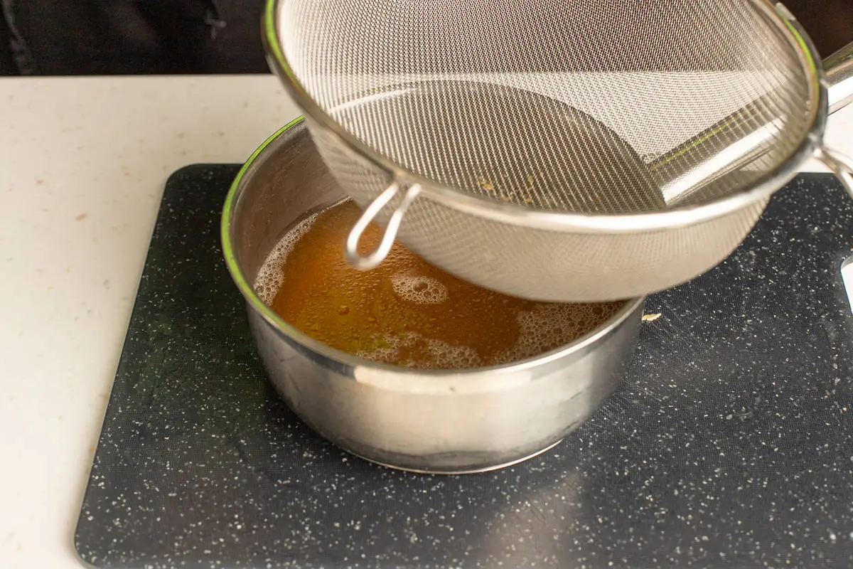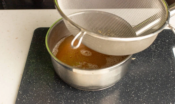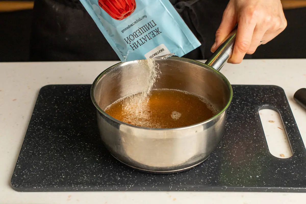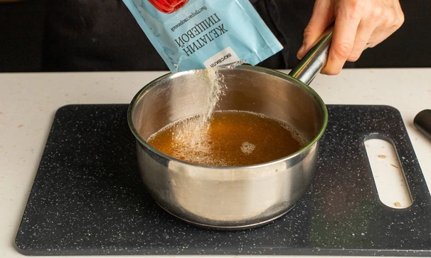 В небольшом количестве тёплого (60-70 °C) бульона, который вы заранее отлили, растворите желатин, тщательно перемешайте и дайте разбухнуть в течение пары минут.