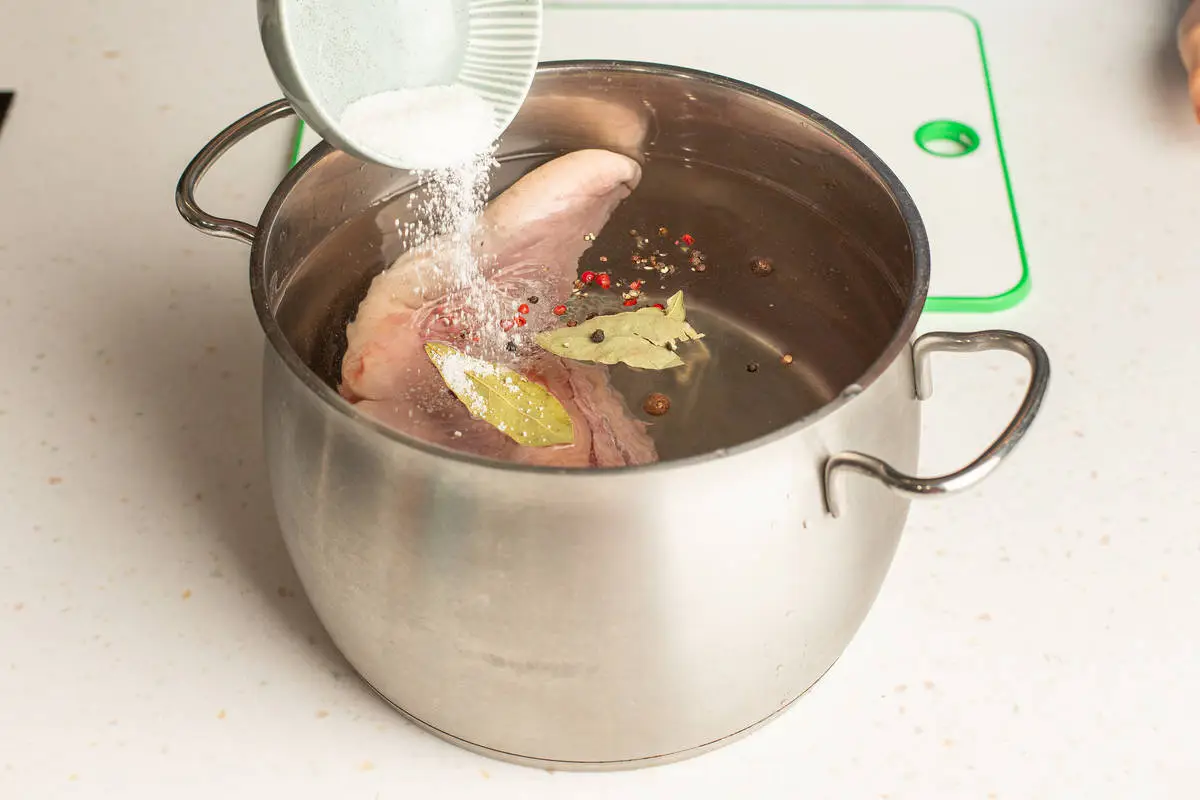 Выньте курицу, её можно использовать для салата или других блюд. Бульон процедите, выбросите сварившиеся овощи. Верните бульон в кастрюлю, добавьте белые грибы и варите ещё 10 минут, посолите по вкусу. У вас должно получиться примерно 2 литра бульона. Отлейте половник бульона в отдельную ёмкость.