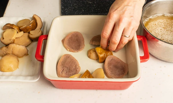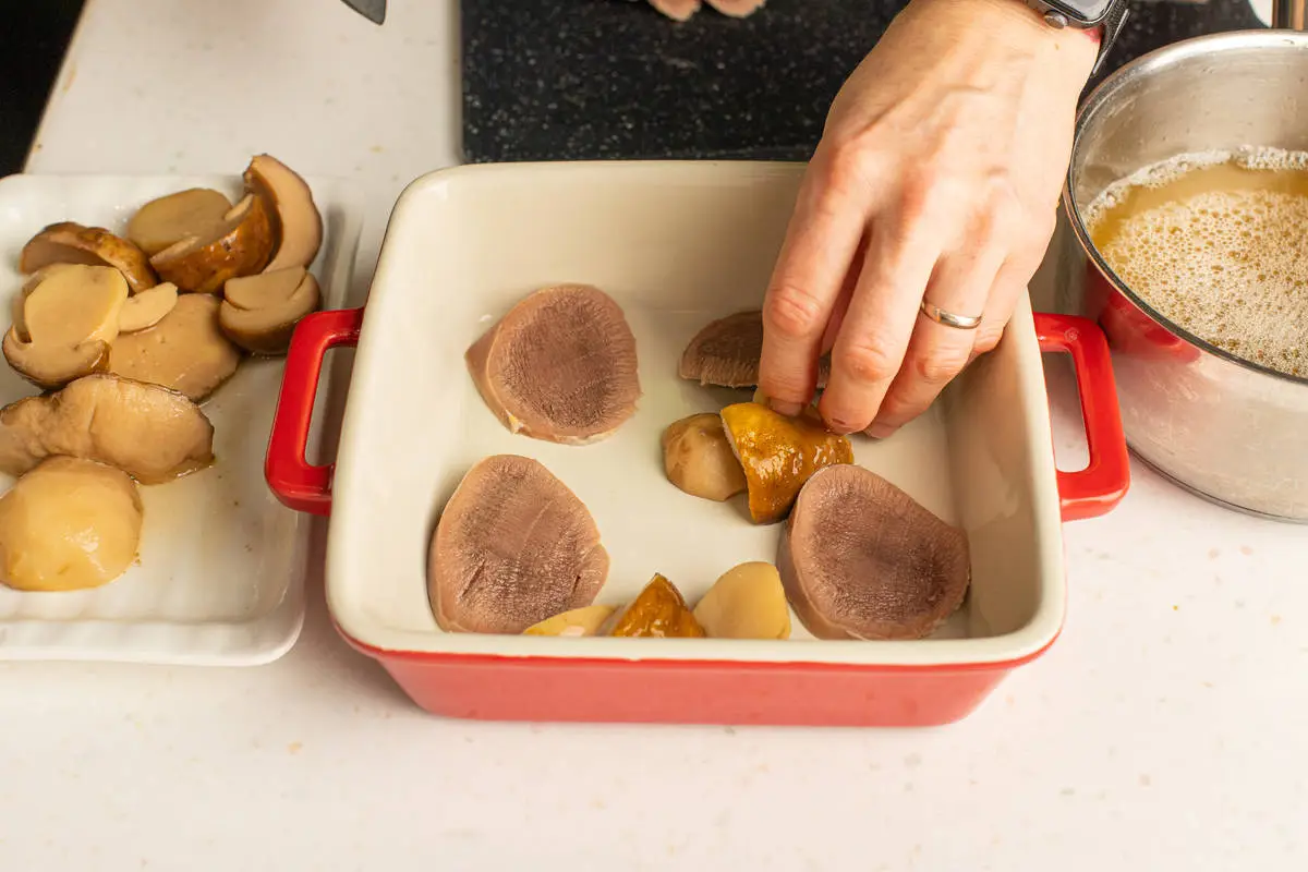 В форму, в которой будете подавать заливное, выложите ломтики языка и грибы.