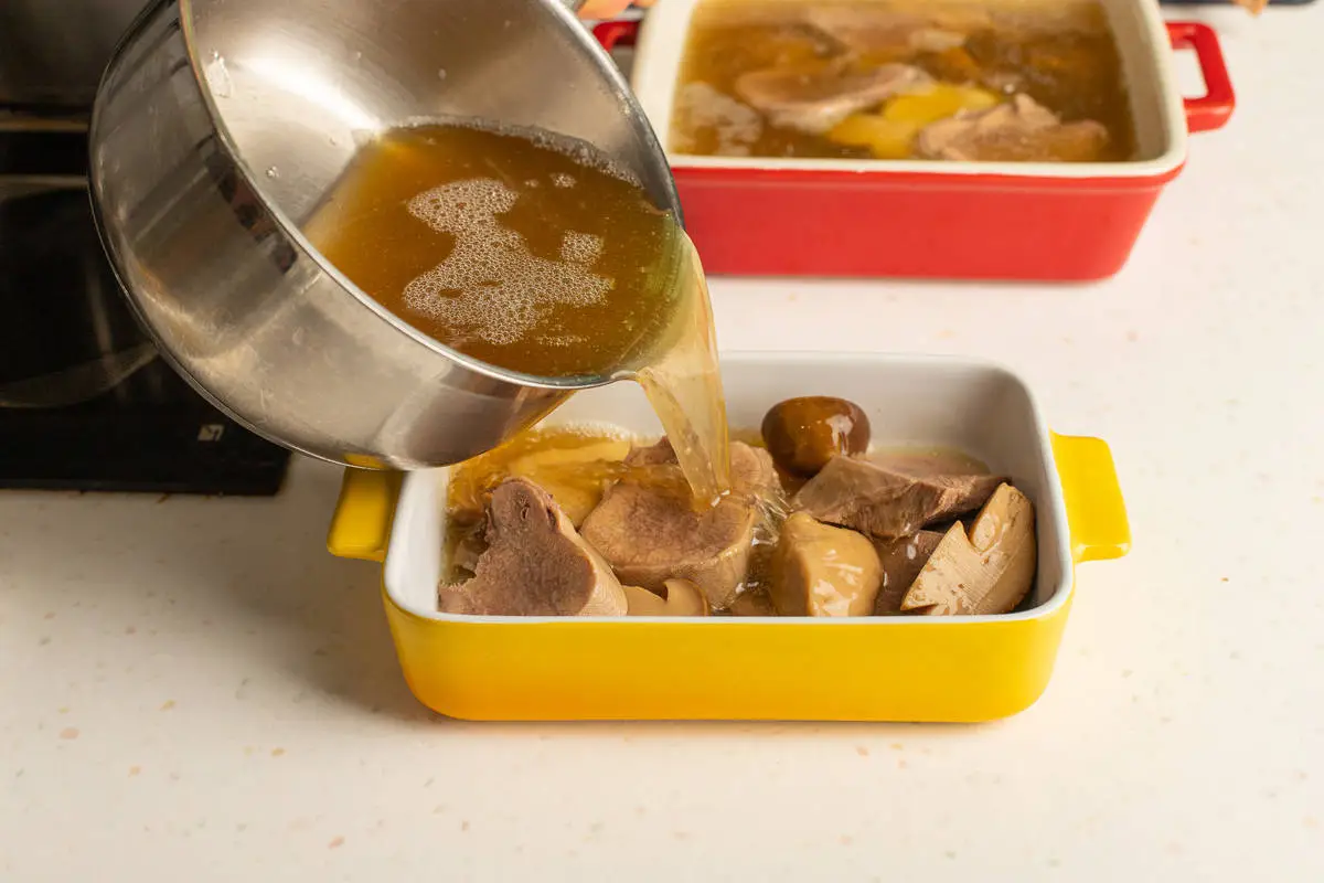 Вылейте желатин к остальному бульону, перемешайте. Залейте бульон в форму с языком и грибами, дайте остыть до комнатной температуры и уберите в холодильник до полного застывания на 4-5 часов.