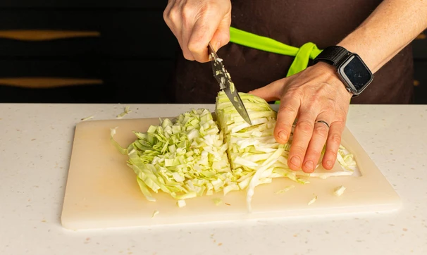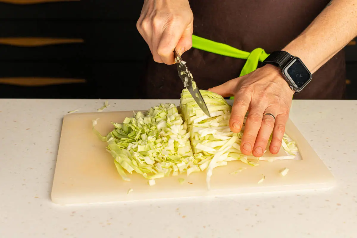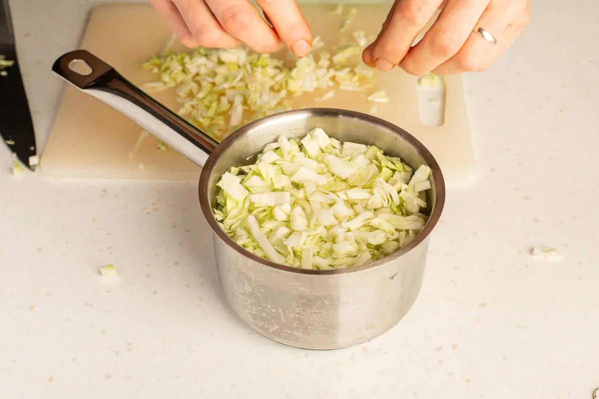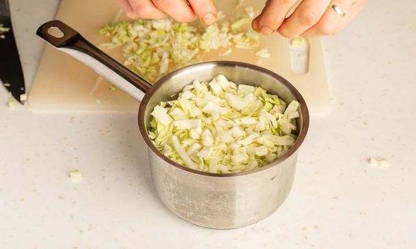 Вскипятите кастрюлю воды. Капусту нашинкуйте.