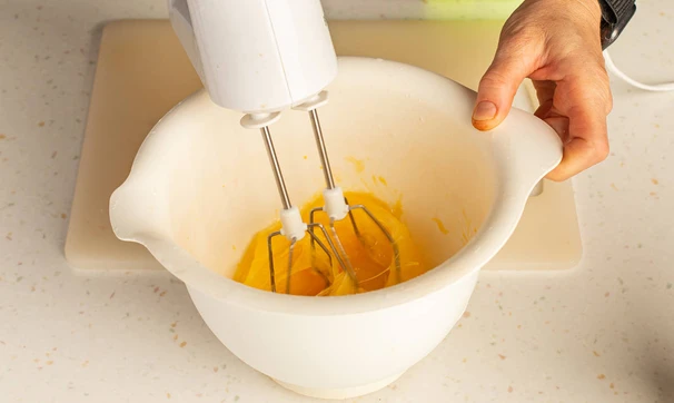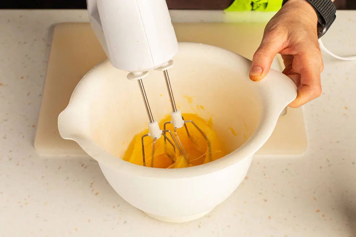 3 яйца взбейте с сахаром в пену, влейте кефир, добавьте муку и соль, смешайте. Получится жидкое тесто.