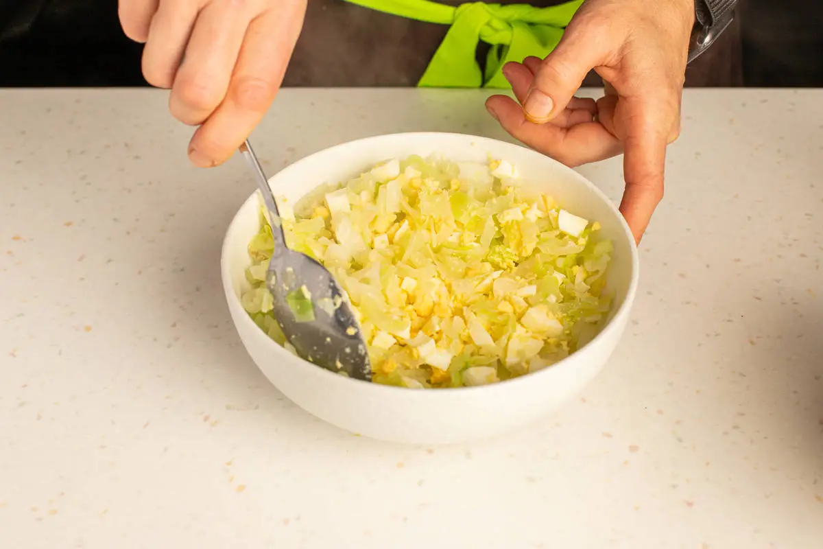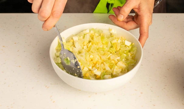 Яйца очистите от скорлупы, нарежьте кубиками. Смешайте с капустой, посолите по вкусу.