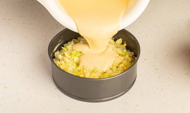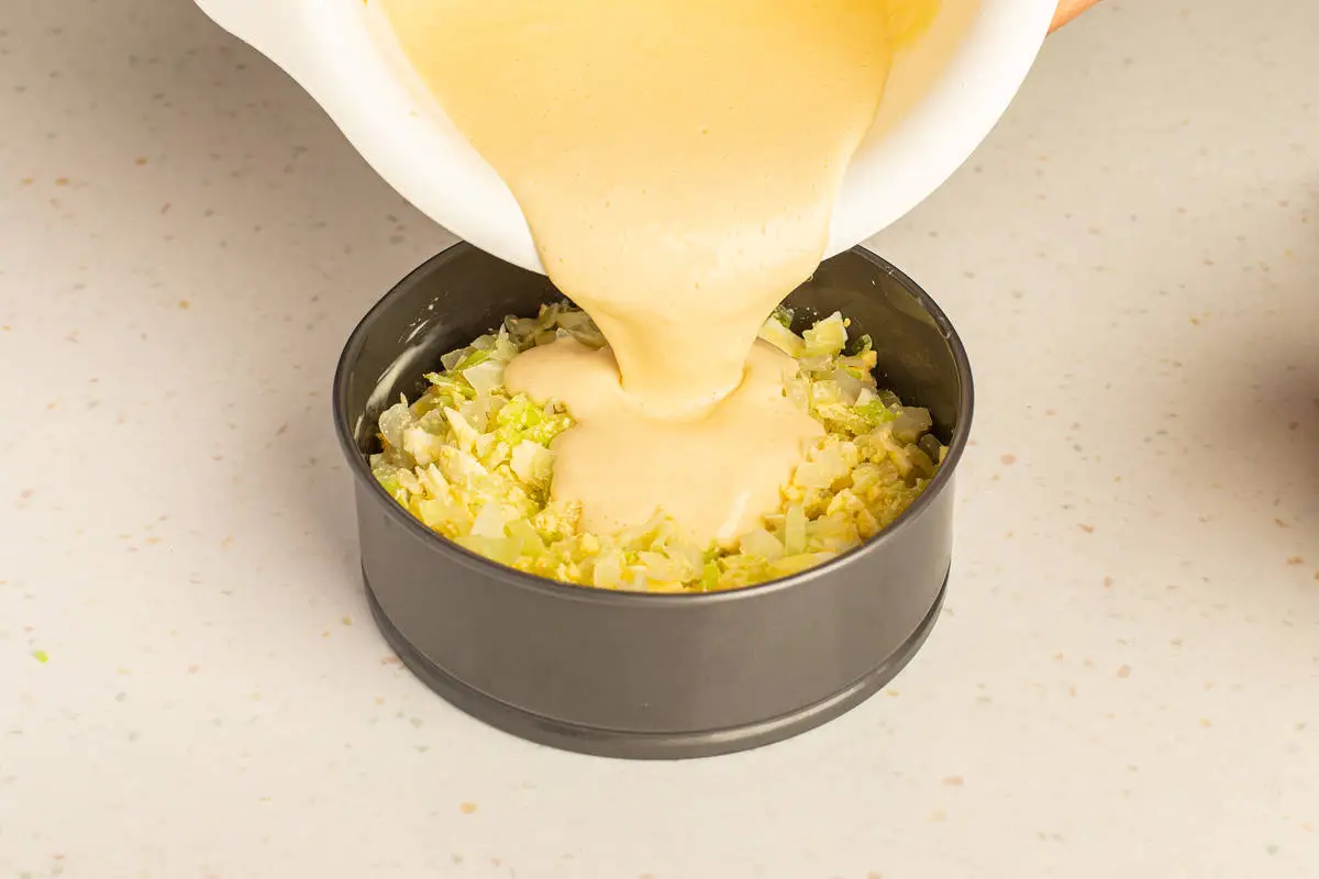 Смажьте форму для запекания маслом, выложите капустную начинку и залейте тестом.