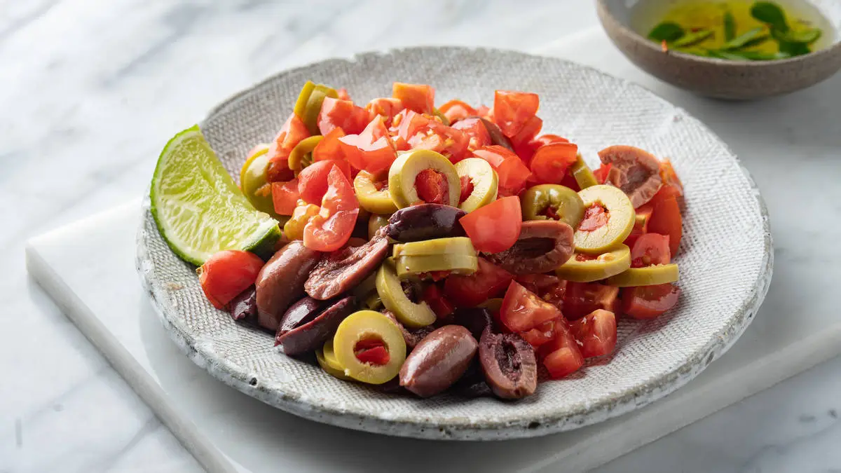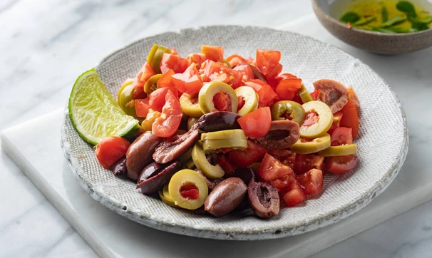 Пока рыба запекается, приготовьте сальсу. Нарежьте оливки половинками или колечками, томаты измельчите. Заправьте оставшейся смесью масла, сока лайма и специй.
