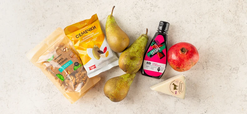 В рецепте используются товары из категорий: Орехи, чипсы и снеки; Сыры; Овощи, фрукты, ягоды, зелень; Масла, соусы, специи, сахар и соль