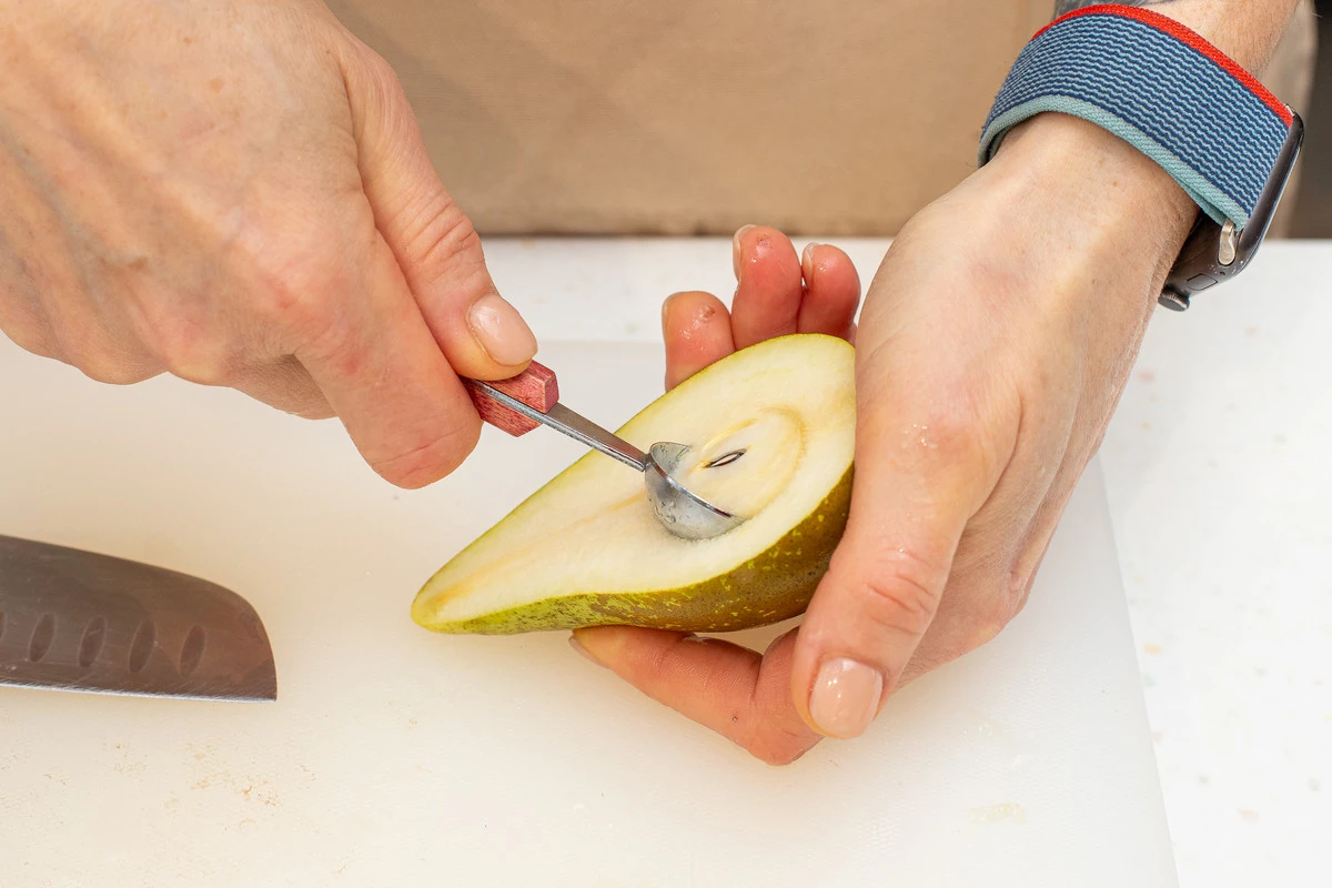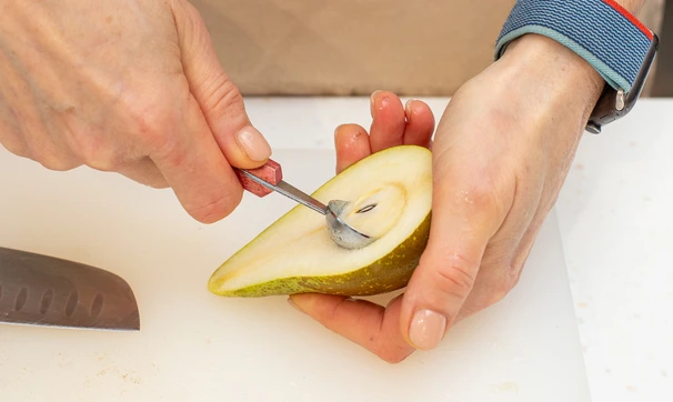 Груши помойте, разрежьте пополам и вырежьте сердцевинки.