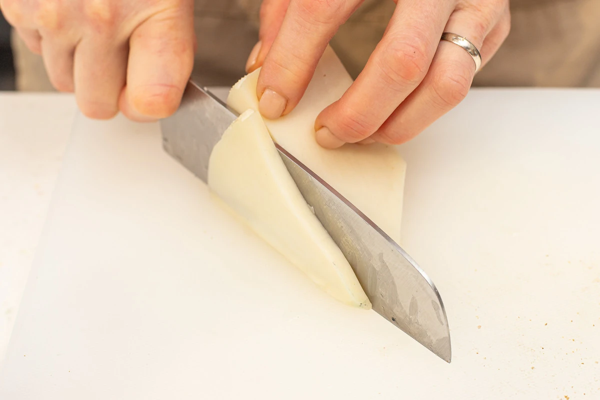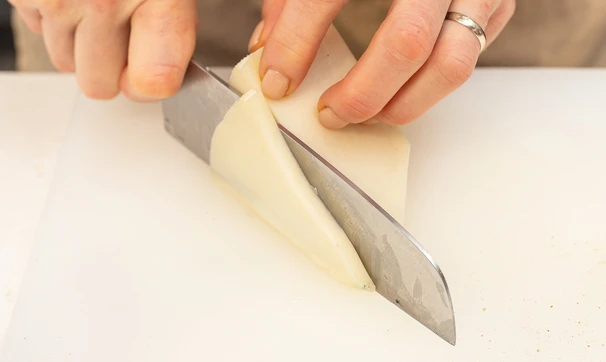 Сыр нарежьте треугольниками толщиной примерно 0,5 см. Каждый кусочек получится весом примерно 20 г.