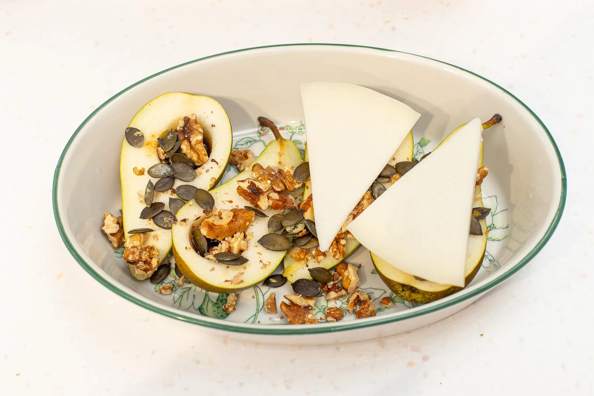 Положите на каждую половинку груши по треугольнику сыра. Запекайте в разогретой до 180 ℃ духовке 12-15 минут.