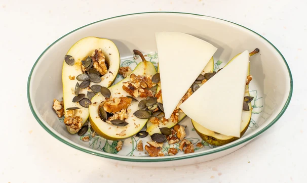 Слегка измельчите грецкие орехи и посыпьте ими груши. Сверху посыпьте тыквенными семечками.