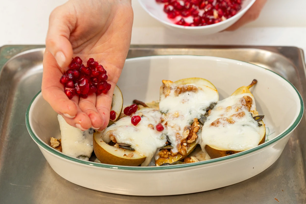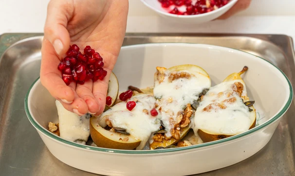 Пока запекаются груши, почистите гранат. Посыпьте готовые груши зёрнами граната и подавайте.