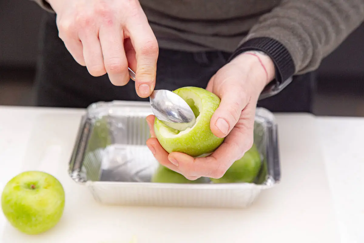 Вырежьте сердцевинку из яблок, удалив косточки. Установите в форму для запекания и влейте по 1 ложке мёда.